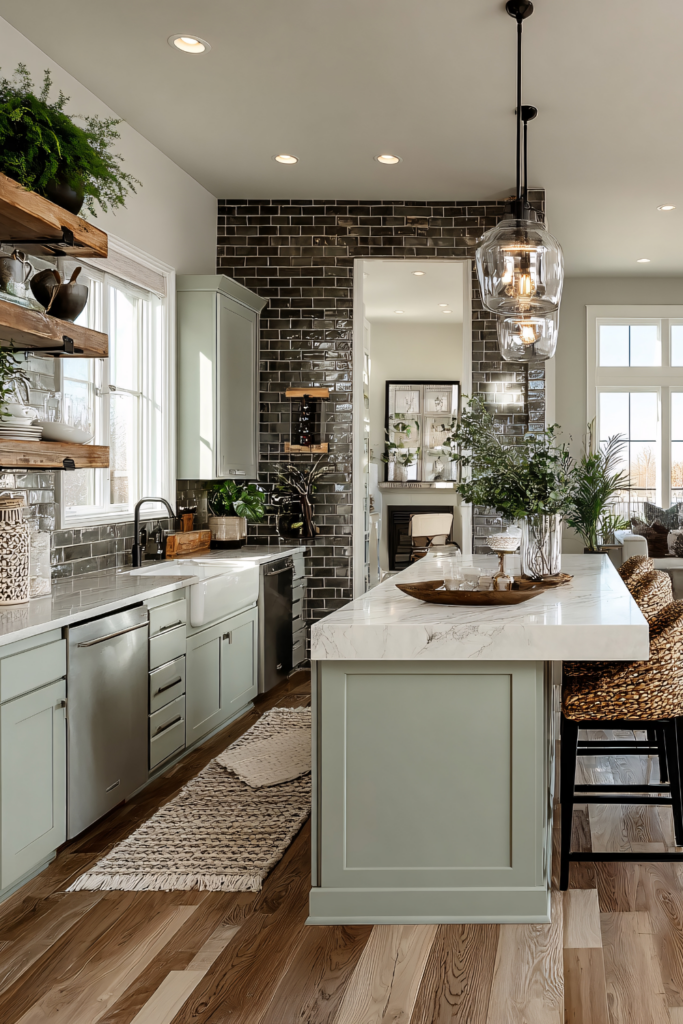 This kitchen embodies modern cottage style—a fresh, livable take on classic comfort that blends vintage warmth with contemporary ease. Soft sage-green cabinetry sets a calming foundation, while open wood shelving and natural accents bring an inviting, collected feel. The glossy charcoal subway tile backsplash adds contrast and depth, grounding the space with a subtle hint of urban edge.