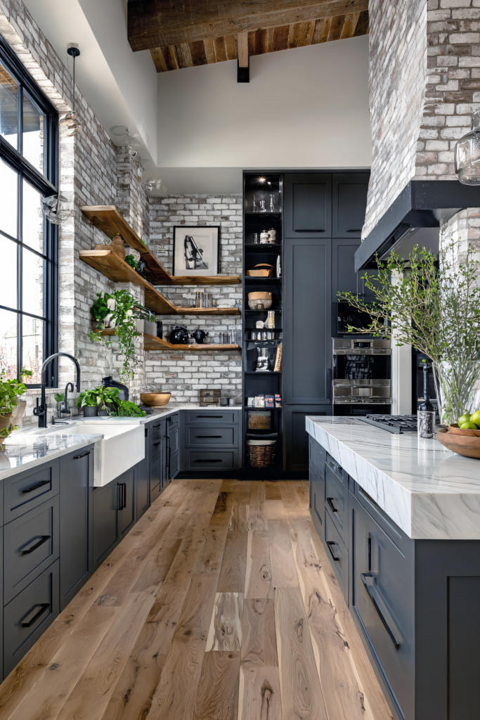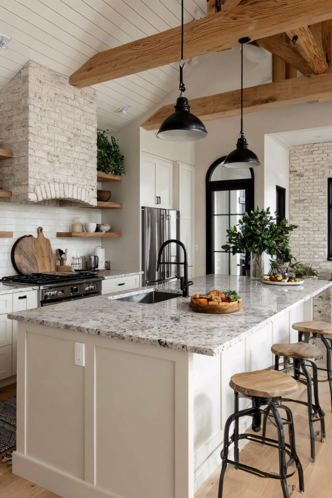 More polished than rustic, this style pairs traditional silhouettes with contemporary finishes. Think shaker cabinetry, statement islands, natural wood floors, and subtle contrast—offering warmth without sacrificing sophistication.