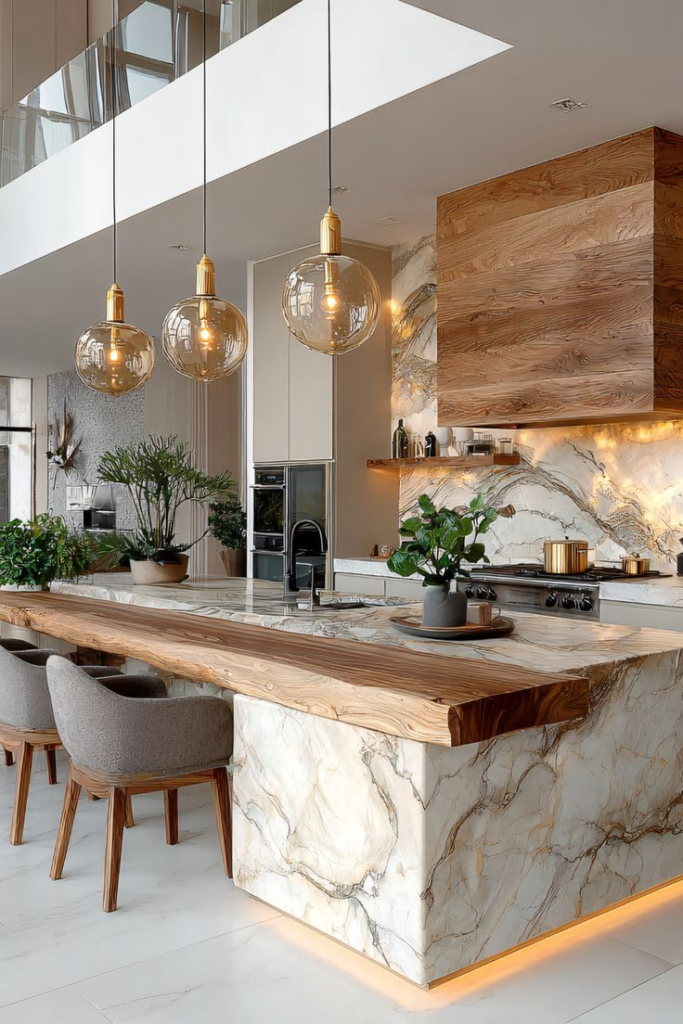 This interior design style is a refined balance of modern minimalism and organic warmth. Sleek marble surfaces with expressive veining set a luxurious foundation, while richly grained wood elements soften the space and add a sense of grounded comfort. Sculptural pendant lights in warm metallic tones create a gentle glow, enhancing the inviting atmosphere without overwhelming the clean architectural lines. Thoughtful details—integrated lighting, natural textures, and curated greenery—bring harmony and depth, making the space feel both elevated and livable. It’s a style that celebrates craftsmanship and calm, perfect for those who love modern design with a soulful, natural edge.