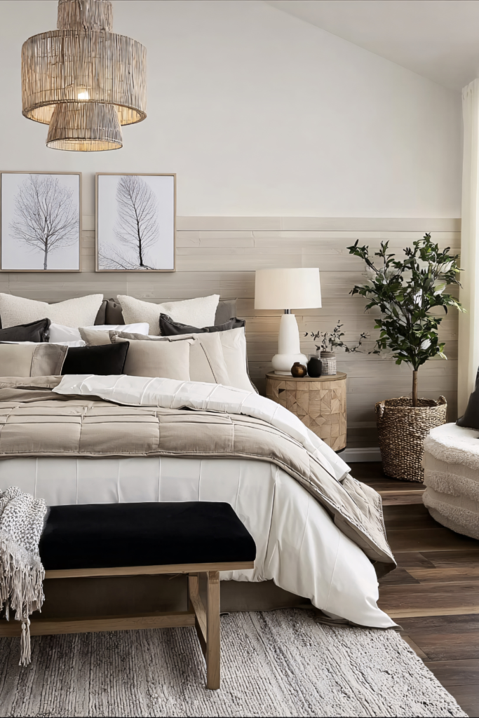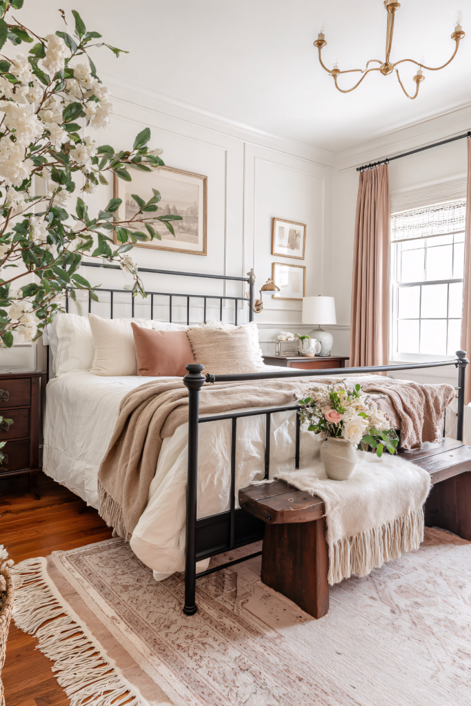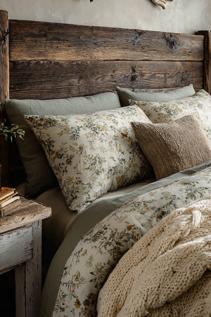 Earthy materials and cozy textures that feel grounded and enduring, think reclaimed wood furniture, stone or brick accents, woven rugs, and layered natural fabrics like linen and wool. This style embraces warmth, authenticity, and a connection to nature, creating a bedroom that feels calm, inviting, and timeless no matter the season.