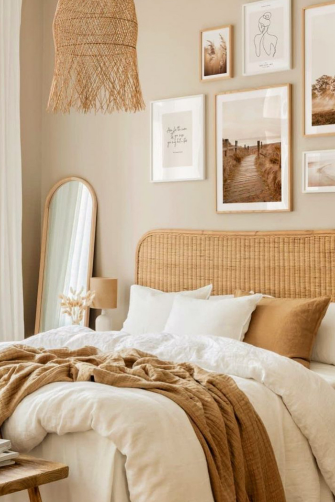 Minimal boho bedroom interior design blends clean lines with relaxed, soulful details for a look that feels both calm and expressive. Soft neutral palettes, natural materials, and uncluttered spaces are layered with subtle textures—think linen bedding, woven accents, and handcrafted décor. The result is an effortlessly stylish bedroom that feels warm, airy, and timeless without ever feeling overdone.