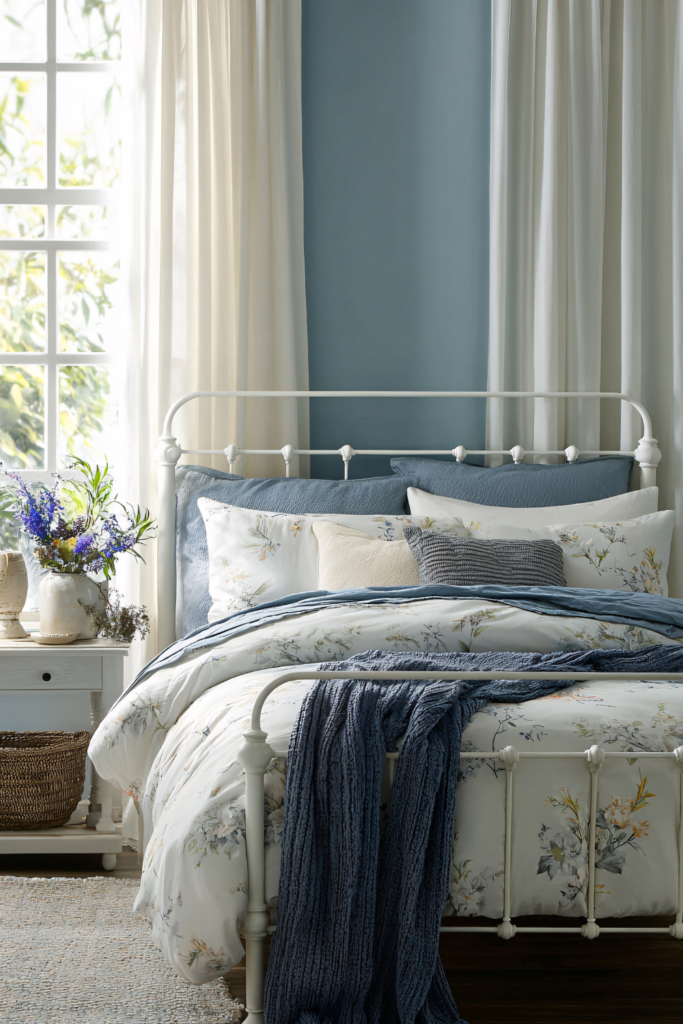Blue cottage style bedroom interior design captures a calm, storybook charm with soft blue hues and cozy, lived-in details. Layered textiles, vintage-inspired furniture, and light, airy fabrics create a space that feels warm and welcoming. Paired with natural textures and classic accents, this style delivers a timeless, serene bedroom that feels both fresh and nostalgic.